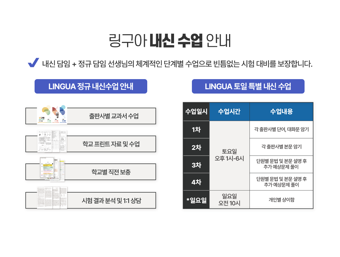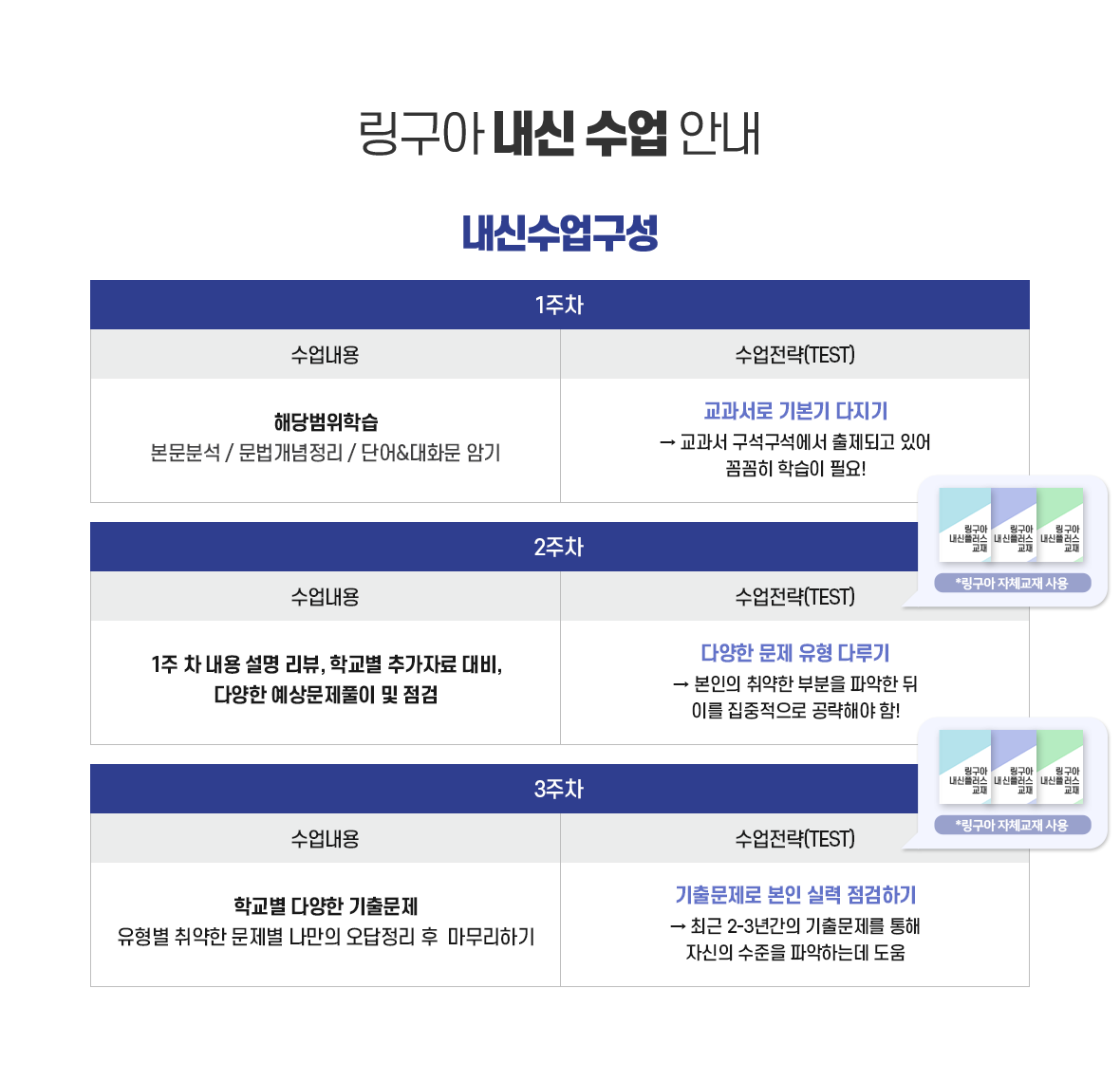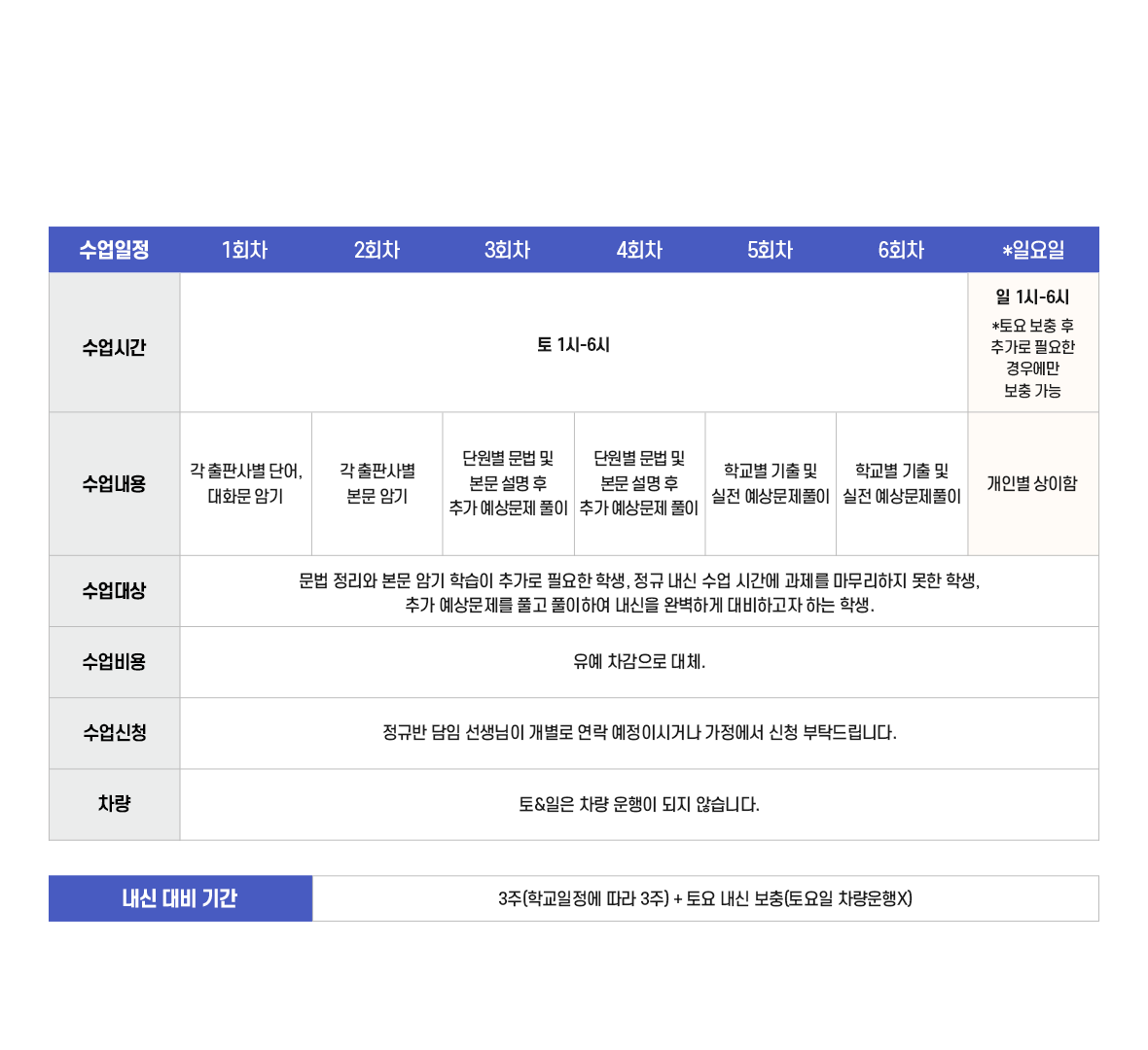 1. 내신 기간에는 학교별 또는 출판사별로 진행되므로 정규시간표와 다를 수 있습니다.